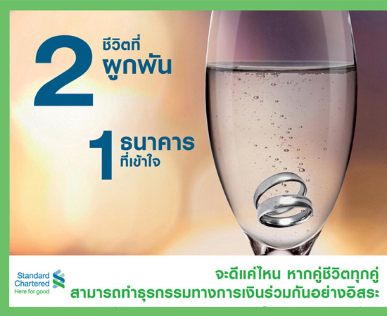 จากธนาคารสแตนดาร์ดชาร์เตอร์ด(ไทย) ที่เข้าใจทุกคู่ชีวิต พร้อมให้อิสระในการทำธุรกรรม โดยไม่จำกัดไลฟ์สไตล์ของคู่ที่ทำธุรกรรมร่วมกัน และไม่จำเป็นต้องแสดงหลักฐานทะเบียนสมรส เช่น