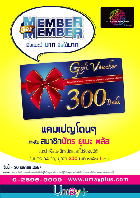 แคมเปญโดนๆ สำหรับสมาชิกบัตรยูเมะ พลัส เพียงแนะนำเพื่อนสมัครบัตร และได้รับการอนุมัติ รับไปเลย บัตรของขวัญมูลค่า 300 บาท ต่อการแนะนำเพื่อน 1 ท่าน และสามารถแนะนำได้ไม่จำกัด