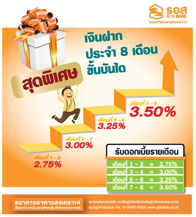 สุดพิเศษ โปรโมชั่นบัญชีเงินฝากประจำ 8 เดือน ขั้นบันได สำหรับลูกค้าผู้ฝากทุกประเภทจากธนาคารอาคารสงเคราะห์ ให้คุณรับดอกเบี้ยสูงสุด 3.50% ต่อปี