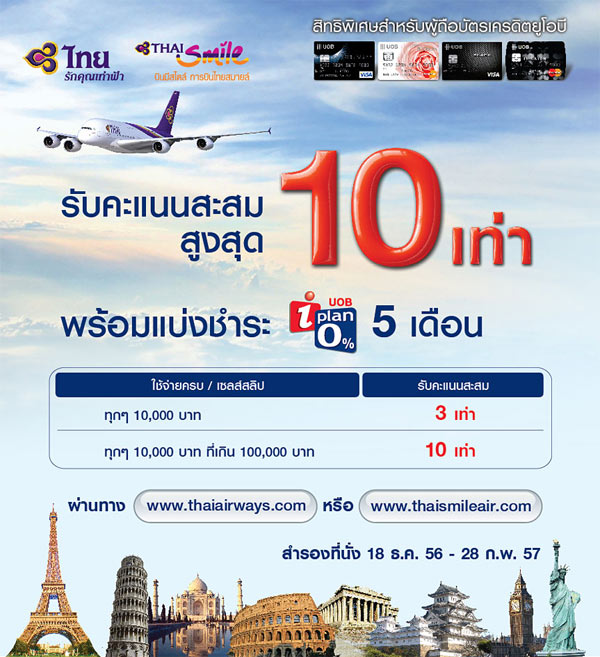- รับคะแนนสะสมเพิ่ม 10 เท่าสำหรับยอดใช้จ่ายผ่านทางเว็บไซต์ www.thaiairways.com และ www.thaismileair.com ทุกๆ 10,000 บาทที่เกิน 100,000 บาทต่อเซลล์สลิป