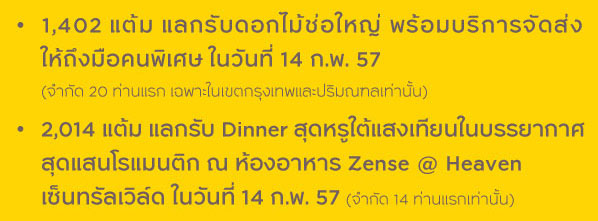 - สงวนสิทธิ์แลกรับช่อดอกไม้สุดหรูมูลค่า 2,000 บาท พร้อมจัดส่งในวันที่ 14 ก.พ.57 และชุดดินเนอร์สุดหรู ณ ห้องอาหาร Zense@Heaven ชั้น 17 เซ็นทรัลเวิลด์ ในวันที่ 14 ก.พ.57 มูลค่า 4,500 บาท โดยข้อกำหนด และเงื่อนไขการให้บริการเป็นไปตามที่ร้านค้าแต่ละแห่งกำหนด