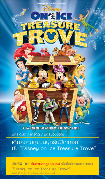 ธนาคารกรุงศรีอยุธยา มอบส่วนลดพิเศษ 15% สำหรับผู้ถือบัตรกรุงศรีเดบิต บัตรเครดิตในเครือกรุงศรี และส่วนลด 10% สำหรับผู้ถือบัตรของขวัญกรุงศรี เมื่อซื้อบัตรชมการแสดง "Disney on Ice Treasure Trove" เปิดรอบแสดงในวันที่ 27 - 30 มีนาคม 2557 ณ อิมแพคอารีนา เมืองทองธานี