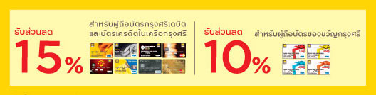 - สำหรับลูกค้าที่ชำระด้วยบัตรกรุงศรี / บัตรของขวัญกรุงศรีเดบิตทุกประเภทของธนาคารกรุงศรีอยุธยา และบัตรเครดิตทุกประเภทของบริษัทในเครือกรุงศรี ที่เคาน์เตอร์ Thai Ticket Major ทุกสาขา (การชำระผ่านทางออนไลน์ และทางโทรศัพท์จะไม่ได้รับส่วนลด)
