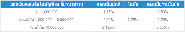 - ธนาคารสงวนสิทธิ์ในการเปลี่ยนแปลงอัตราดอกเบี้ยรวมทั้งโบนัส และรายละเอียดเงื่อนไขต่างๆ โดยไม่ต้องแจ้งให้ทราบล่วงหน้า ทั้งนี้ ดุลยพินิจของธนาคารถือเป็นที่สุด