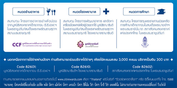 สมาชิกบัตรเครดิตซิตี้แบงก์สามารถร่วมเป็นส่วนหนึ่งในการแบ่งปันความสุข... ซิตี้แบงก์จะบริจาคเงิน 5% ของมูลค่าคะแนนสะสมที่ท่านได้รับ ให้แก่มูลนิธิที่เข้าร่วมโครงการตามหมวดของยอดการใช้จ่าย เพียงมียอดใช้จ่ายผ่านบัตรฯ ครบ 2,000 บาทขึ้นไป/เซลล์สลิป โดยที่ท่านจะได้รับคะแนนสะสมปกติ