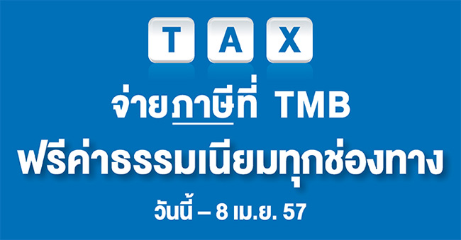 จ่ายภาษีที่ TMB ฟรีค่าธรรมเนียมจ่ายภาษีให้กับสรรพากร ผ่าน TMB ฟรีค่าธรรมเนียม ทุกช่องทาง วันนี้ - 8 เม.ย. 57