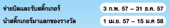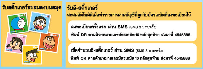 *กรณีสะสมทั้งสติ๊กเกอร์ และอี-สติ๊กเกอร์ สามารถนำสติ๊กเกอร์มาเปลี่ยนเป็น อี-สติ๊กเกอร์ ที่สาขาธนาคารฯ โดยจะได้รับอี-สติ๊กเกอร์เข้าบัญชีที่ผูกกับบัตรเดบิตที่ลงทะเบียนไว้ ภายใน 30 วัน