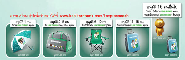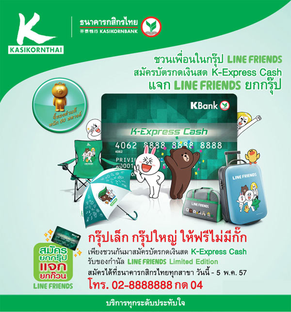 กรุ๊ปเล็ก กรุ๊ปใหญ่ ให้ฟรีไม่มีกั๊ก เพียงชวนเพื่อนในกรุ๊ป LINE FRIEND สมัครบัตรกดเงินสด K-Express Cash รับของกำนัล LINE FRIEND Limited Edition สมัครได้ที่ธนาคารกสิกรไทยทุกสาขา