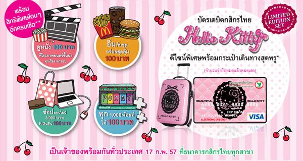 เงื่อนไขกระเป๋าเดินทาง Hello Kitty Limited Edition - สำหรับลูกค้าที่สมัครบัตร Hello Kitty Limited Edition ทางธนาคารจะส่งกระเป๋าเดินทาง Hello Kitty ให้ทางไปรษณีย์ภายใน 30 วันหลังจากสมัครบัตร
