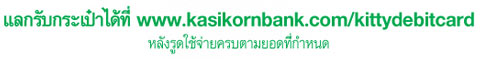- ของรางวัลมีจำนวนจำกัดสงวนสิทธิ์กับลูกค้าที่มีการใช้จ่ายผ่านบัตรเดบิตที่ร่วมรายการ และเป็นไปตามลำดับก่อนหลังในการทำรายการผ่าน www.kasikornbank.com/kittydebitcard