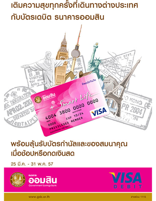 คุณสมบัติของผู้เข้าร่วมกิจกรรม : ผู้ถือบัตรออมสิน วีซ่า เดบิต สมาร์ท ไลฟ์, บัตรออมสิน วีซ่า เดบิต, บัตรออมสิน วีซ่า เดบิต อินสแตนส์ และบัตรออมสิน วีซ่า อิเลคตรอน ที่ชำระค่าสินค้าและบริการผ่านเครื่องรูดซื้อสินค้า (EDC) หรือถอนเงินสด จากเครื่อง ATM ในต่างประเทศ เท่านั้น