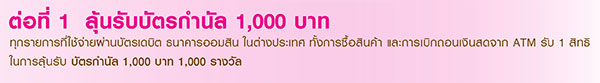 - หมดเขตการแลกรับของรางวัล ภายในวันที่ 31 กรกฎาคม 2557 (ร้านค้า / เครื่อง ATM ที่เข้าร่วมรายการ สำหรับร้านค้า และเครื่อง ATM ในต่างประเทศ)