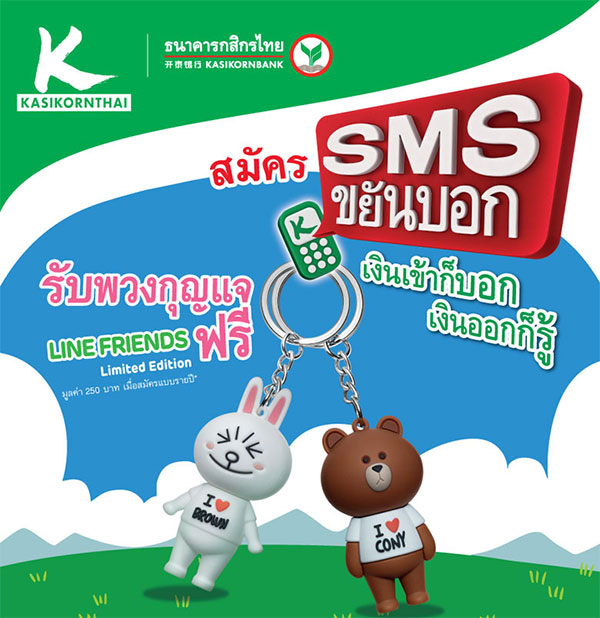 สมัครบริการ SMS ขยันบอก กับธ.กสิกรไทยวันนี้ รับฟรี! พวงกุญแจ LINE FRIENDS Limited Edition