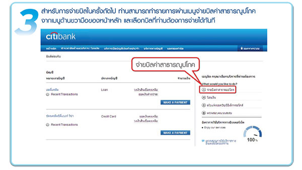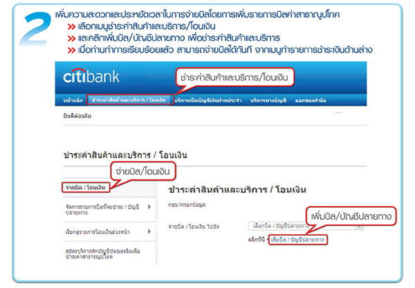 - สำหรับสมาชิกบัตรเครดิตซิตี้แบงก์สามารถเลือกชำระค่าโทรศัพท์มือถือ/สาธารณูปโภค/ประกันภัย/อินเทอร์เน็ต และลูกค้าบัญชีซิตี้แบงก์เรดดี้เครดิตสามารถเลือกชำระค่าโทรศัพท์มือถือ/สาธารณูปโภค/อินเตอร์เน็ตผ่านซิตี้แบงก์ออนไลน์ตั้งแต่ 1 ม.ค.- 31 ธ.ค. 57 เท่านั้น