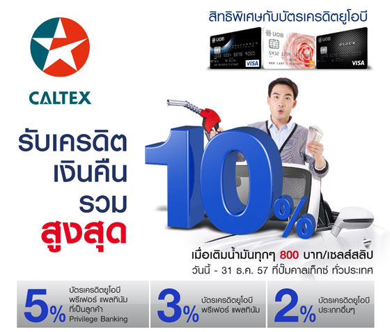 บัตรเครดิตยูโอบีให้คุณรับเงินคืนสูงสุด 10%* เมื่อเติมน้ำมันที่ปั๊มคาลเท็กซ์ วันนี้ - 31 ธ.ค.57