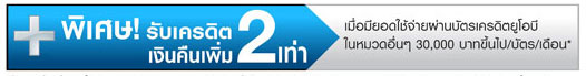 - สงวนสิทธิ์เฉพาะบัตรเครดิตยูโอบี ที่ออกในประเทศเท่านั้นยกเว้นบัตรเครดิตเพื่อธุรกิจ โดยผู้ถือบัตรจะต้องคงสภาพการเป็นสมาชิกบัตร และไม่ผิดนัดชำระจนถึงวันที่ธนาคารทำการเครดิตเงินคืนสงวนสิทธิ์เฉพาะผู้ถือบัตรที่ลงทะเบียนผ่านระบบ SMS มายังหมายเลขที่กำหนดไว้ในสื่อส่งเสริมการขายนี้ กรณีมีผู้ถือบัตรหลักหลายใบให้ลงทะเบียนเพียงครั้งเดียว (ค่าส่ง 3 บาท/ครั้ง/โปรแกรม) ยกเว้นผู้ถือบัตรเครดิตยูโอบี พรีเฟอร์ แพลทินัม ที่เป็นลูกค้า Privilege Banking ไม่ต้องลงทะเบียน SMS