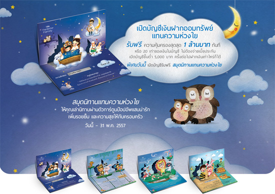 เงื่อนไข - สงวนสิทธิ์เฉพาะลูกค้าที่เปิดบัญชีเงินฝากออมทรัพย์แทนความห่วงใย ตั้งแต่วันที่ 10 มี.ค. 57 - 31 พ.ค. 57 เท่านั้น