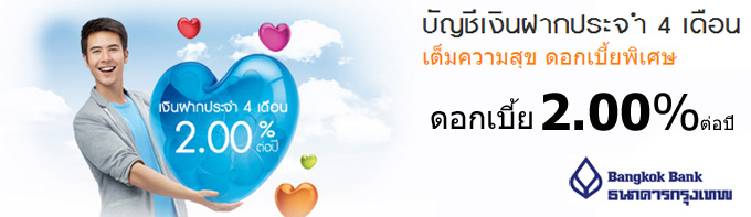 ธนาคารกรุงเทพเปิดตัวบัญชีเงินฝากประจำ 4 เดือน อัตราดอกเบี้ย 2.00% ต่อปี รับฝากตั้งแต่ 200,000 บาทขึ้นไป ที่ธนาคารกรุงเทพทุกสาขา