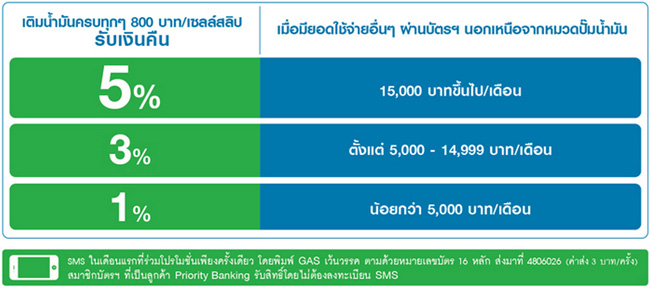 ข้อกำหนดและเงื่อนไข - รับเงินคืน 1% หรือ 3% หรือ 5% (เมื่อมียอดใช้จ่ายผ่านบัตรฯ ในหมวดอื่นๆ ตามเงื่อนไขที่กำหนด) จากยอดการใช้จ่ายผ่านบัตรฯครบทุกๆ 800 บาท/เซลล์สลิป ที่ทุกปั๊มน้ำมัน ระหว่างวันที่ 1 ก.พ. 57 - 31 ม.ค. 58 โดยยอดใช้จ่ายผ่านบัตรฯ จะคำนวณตามเดือนปฏิทิน
