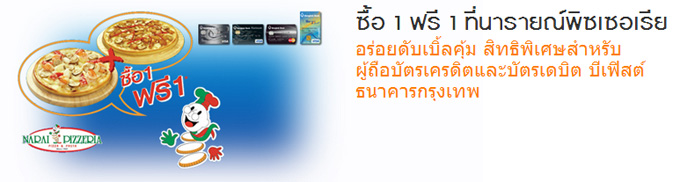 เงื่อนไขเป็นไปตามที่ร้านค้าและธนาคารกรุงเทพกำหนด - โปรโมชั่นซื้อ 1 แถม 1 ใช้ได้กับพิซซ่าถาดกลาง และถาดใหญ่ (พิซซ่าที่แถมต้องมีราคาเท่ากัน หรือต่ำกว่าพิซซ่าที่ซื้อ) และรับส่วนลด 10% สำหรับค่าอาหารเมนูอื่นๆ ตั้งแต่ 1 เมษายน - 30 มิถุนายน 2557