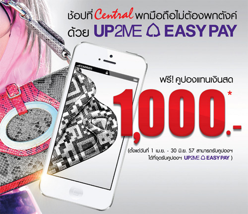 ธนาคารไทยพาณิชย์ เอาใจนักช้อปยุคดิจิตอลให้ได้สัมผัสประสบการณ์ช้อปปิ้งรูปแบบใหม่แบบไม่ต้องควักตังค์ ครั้งแรกในเมืองไทยกับการชำระค่าสินค้าในเซ็นทรัล ดีพาร์ทเมนท์สโตร์ทุกสาขา และเซน ด้วยการสแกนคิวอาร์โค้ด (QR Code) ผ่าน "UP2ME Easy Pay" โมบายเพย์เมนท์แอพพลิเคชั่นด้วยโปรโมชั่นพิเศษ ฟรี!! คูปองแทนเงินสดมูลค่ารวม 1,000 บาท เพื่อใช้เป็นส่วนลดเพิ่มเมื่อชำระค่าสินค้าด้วยแอพพลิเคชั่น โดยสามารถใช้ได้ทุกแผนก และใช้ร่วมกับโปรโมชั่นปกติได้ เพียงดาวน์โหลดพร้อมสมัครใช้งาน และแสดงแอพพลิเคชั่นแก่เจ้าหน้าที่ ณ จุดลูกค้าสัมพันธ์ หรือสาขาธนาคารไทยพาณิชย์ภายในห้างเซ็นทรัล ดีพาร์ทเมนท์สโตร์ และเซนทุกสาขาทั่วประเทศ ตั้งแต่วันนี้ - 30 มิ.ย. 57