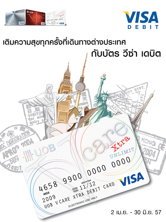เติมความสุขทุกครั้งที่เดินทางต่างประเทศ กับบัตร วีซ่า เดบิต ธนาคารยูโอบี พิเศษ! จากบริษัท วีซ่า อินเตอร์เนชั่นแนล (เอเชีย-แปซิฟิค) แอลแลซี สำหรับผู้ถือบัตรวีซ่า เดบิต ลุ้นรับบัตรกำนัล เมื่อใช้จ่ายตามเงื่อนไขที่กำหนด
