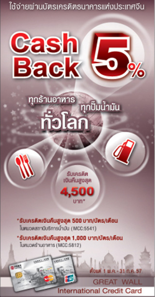 - เครดิตเงินคืนสำหรับลูกค้าที่มียอดใช้จ่ายสะสมในหมวดสถานีบริการน้ำมัน โดยมี Merchant Category Code (MCC) ได้แก่ 5541 ผ่านบัตรเครดิต Great Wall ทั้งประเภทมาสเตอร์การ์ดและยูเนียนเพย์ วันที่ 1 พฤษภาคม - 31 กรกฎาคม 2557 ทั่วโลก