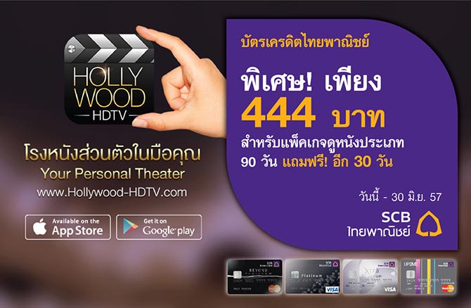 โปรโมชั่นโดนๆ สำหรับคนรักหนัง พิเศษเฉพาะผู้ถือบัตรเครดิตไทยพาณิชย์ สามารถรับชมภาพยนตร์ผ่านมือถือ พิเศษเพียง 444 บาท สำหรับแพ็คเกจดูหนังประเภท 90 วัน แถมฟรี 30 วัน เมื่อชำระผ่านบัตรเครดิตไทยพาณิชย์ ตั้งแต่วันนี้ - 30 มิ.ย. 57