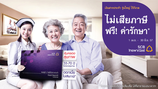 ธนาคารไทยพาณิชย์ สร้างสรรค์ผลิตภัณฑ์เงินฝากเจาะกลุ่มลูกค้าช่วงวัยเกษียณโดยเฉพาะ นำเสนอทางเลือกพิเศษในการออมเงินผ่านบัญชีเงินฝากประจำ 12 เดือน "รุ่นใหญ่ ไร้กังวล" ที่ให้อัตราดอกเบี้ยสุดคุ้มและไม่เสียภาษี พร้อมรับสิทธิประโยชน์ ฟรี ประกันสุขภาพแบบผู้ป่วยใน เป็นระยะเวลา 1 ปี โดยไม่ต้องตรวจร่างกาย รับวงเงินความคุ้มครองสูงกว่า 100,000 บาท/ครั้ง ข้อเสนอสุดคุ้มเฉพาะที่ธนาคารไทยพาณิชย์เพียงแห่งเดียว มั่นใจได้รับการตอบรับจากกลุ่มเป้าหมายทั่วประเทศ ด้วยสามารถตอบโจทย์ด้านผลตอบแทนและปิดช่องว่างการประกันสุขภาพในรูปแบบอื่นสำหรับกลุ่มลูกค้าวัย 55-70 ปี ได้อย่างลงตัว ผู้สนใจสามารถเปิดบัญชี "รุ่นใหญ่ ไร้กังวล" ได้ตั้งแต่วันนี้ - วันที่ 30 มิถุนายน 2557