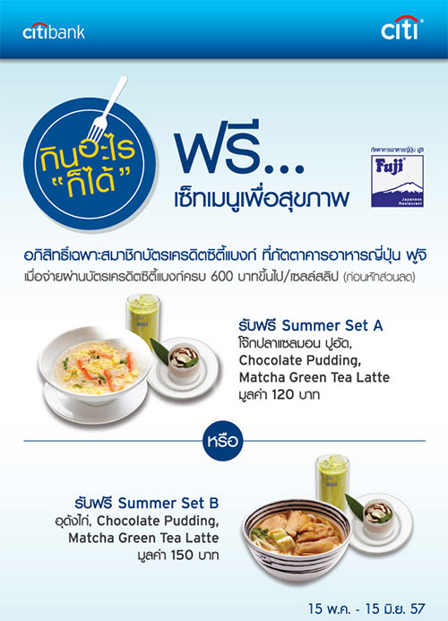 อภิสิทธิ์เฉพาะสมาชิกบัตรเครดิตซิตี้แบงก์ ที่ภัตตาคารอาหารญี่ปุ่น ฟูจิ ฟรี...เซ็ทเมนูเพื่อสุขภาพ เมื่อใช้จ่ายผ่านบัตรเครดิตซิตี้แบงก์ครบ 600 บาทขึ้นไป/เซลล์สลิป (ก่อนหักส่วนลด)
