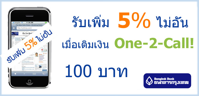 รับโบนัสเพิ่ม 5% ไม่อั้น เมื่อเติมเงินมือถือ One-2-Call! 100 บาท ผ่านบัวหลวง ไอแบงก์กิ้ง หรือบัวหลวง เอ็มแบงก์กิ้ง