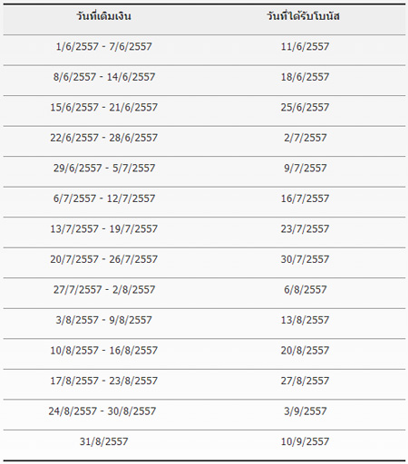 - โบนัสเพิ่ม 5% จะถูกเติมให้กับหมายเลขโทรศัพท์มือถือที่เติมเงินในทุกวันพุธถัดไป กำหนดการได้รับโบนัส ดังตารางด้านล่าง