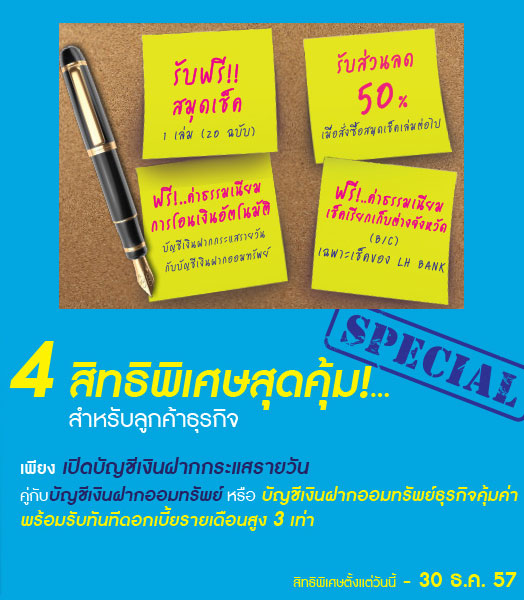 - ฟรี ค่าธรรมเนียมเช็คเรียกเก็บต่างจังหวัด (B/C) เฉพาะเช็คของ LH Bank (กำหนดระยะเวลาตั้งแต่ 8 พ.ค. - 30 ธ.ค.2557)