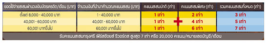 - สมาชิกบัตรต้องมียอดใช้จ่ายสะสมตั้งแต่ 8,000 บาทขึ้นไปต่อเดือน ต่อหมายเลขบัญชี ในการรับสิทธิ์แลกคะแนน