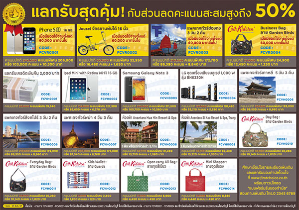 "แลกรับสุดคุ้ม!" ของรางวัลพิเศษกับส่วนลดคะแนนสูงสุดถึง 50 % จำกัดการแลกของรางวัล 2 ชิ้น ต่อเดือน ต่อหมายเลขบัญชี เริ่ม 1 พ.ค. - 31 ส.ค. 57