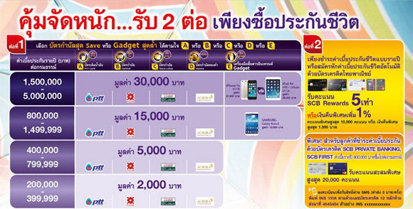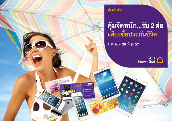 เงื่อนไขและข้อกำหนด - รายการส่งเสริมการขายนี้ใช้ระหว่างวันที่ 1 พ.ค. - 30 มิ.ย. 57 เฉพาะลูกค้าที่ทำรายการซื้อประกันใหม่ผ่านธนาคารไทยพาณิชย์และชำระเบี้ยประกันรายปีเท่านั้น