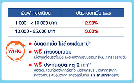 - อัตราดอกเบี้ย 3.60% ต่อปี เมื่อมียอดเงินฝากต่อเดือน 10,000 - 25,000 บาท และอัตราดอกเบี้ย 2.90% ต่อปี เมื่อมียอดเงินฝากตั้งแต่ 1,000 บาท แต่ไม่ถึง 10,000 บาท