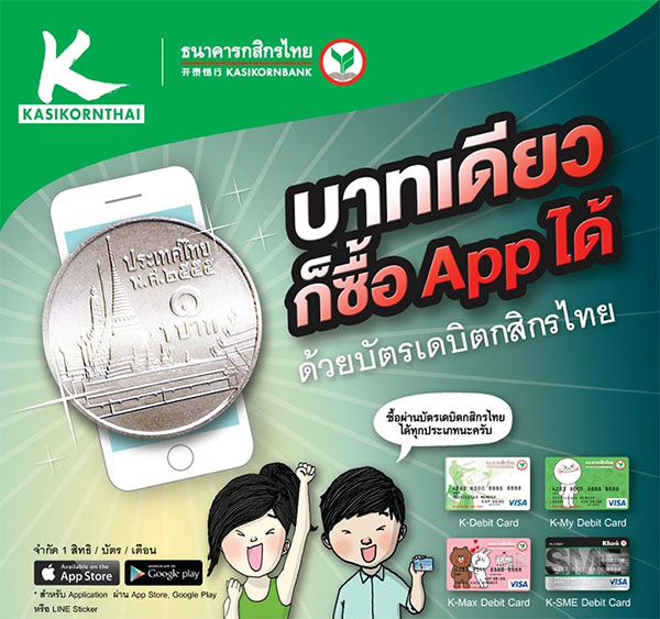 บาทเดียวก็ซื้อ App ได้ ด้วยบัตรเดบิตกสิกรไทย