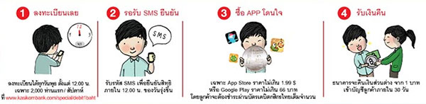 บาทเดียวก็ซื้อ App ได้ ด้วยบัตรเดบิตกสิกรไทย รีบลงทะเบียนก่อนใคร (2,000 ท่านแรกเท่านั้น) เริ่มลงทะเบียนวันพุธที่ 16 กรกฎาคม 2557 ตั้งแต่ 12.00 น.เป็นต้นไป ที่