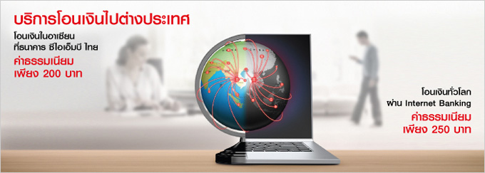 โอนเงินผ่านเคาน์เตอร์ธนาคาร ซีไอเอ็มบี ไทย ไปยังประเทศในภูมิภาคอาเซียน ค่าธรรมเนียมการโอนเพียง 200 บาท/ครั้ง จากปกติ 500 บาท (มาเลเซีย อินโดนีเซีย สิงคโปร์ พม่า ลาว กัมพูชา บรูไน ฟิลิปปินส์ และเวียดนาม)