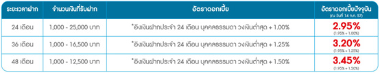 - ระยะเวลาฝาก 24 เดือน บวกเพิ่ม 1.00% ต่อปี