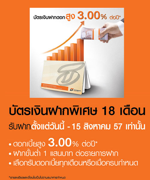 บัตรเงินฝากพิเศษ ระยะเวลาฝาก 18 เดือน รับฝากจากลูกค้าทุกประเภท ยกเว้น กองทุน บริษัทประกัน สถาบันการเงิน และผู้มีถิ่นฐานอยู่นอกประเทศ สามารถเลือกรับดอกเบี้ยทุกเดือนหรือเมื่อครบกำหนดได้ และเมื่อครบกำหนดจะโอนเงินต้นเข้าบัญชีเงินฝากออมทรัพย์ หรือบัญชีเงินฝากกระแสรายวัน ซึ่งผูกไว้กับบัญชีบัตรเงินฝากดังกล่าว โดยธนาคารเปิดรับฝากตั้งแต่วันนี้ - 15 สิงหาคม 2557