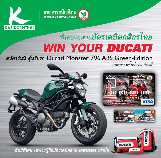 พิเศษเฉพาะบัตรเดบิตกสิกรไทย WIN YOUR DUCATI สมัครวันนี้ลุ้นรับรถ Ducati Monster 796 ABS Green-Edition ยนตรกรรมชั้นนำจากอิตาลี