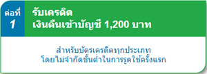 - รับเครดิตเงินคืนเข้าบัญชี 1,200 บาท เมื่อมีการใช้จ่ายผ่านบัตรอขย่างน้อย 1 ครั้ง ภายใน 30 วันหลังจากวันที่บัตรเครดิตได้รับการอนุมัติโดยธนาคารฯ จะมอบเงินคืนเข้าบัญชีให้สมาชิกบัตรภายใน 90 วัน หลังจากครบกำหนด 30 วันหลังจากวันที่บัตรเครดิตได้รับการอนุมัติ