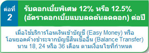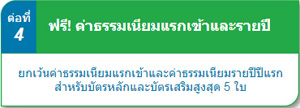 - รับเงินคืนเข้าบัญชีเพิ่มอีก 100 บาท เมื่อสมัครใบแจ้งยอดบัญชีอิเล็กทรอนิกส์ โดยผู้สมัครจะต้องเลือกสมัครใบแจ้งยอดบัญชีอิเล็กทรอนิกส์และส่งพร้อมกับใบสมัครของบัตรเครดิตในคราวเดียวกัน ทั้งนี้ ธนาคารฯ จะมอบเงินคืนเข้าบัญชีให้สมาชิกบัตรภายใน 90 วัน หลังจากวันที่ลูกค้าได้สมัครใบแจ้งยอดบัญชีอิเล็กทรอนิกส์กับธนาคารฯ