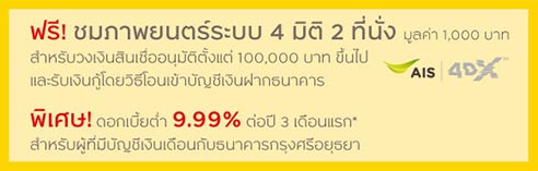- * อัตราดอกเบี้ย 9.99 % ต่อปี เฉพาะ 3 เดือนแรก และรับเงินกู้โดยวิธีโอนเข้าบัญชีเงินฝากของธนาคารกรุงศรีอยุธยาเท่านั้น
