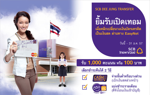 "ยิ้มรับเปิดเทอม" รับ 1,000 คะแนน หรือ 100 บาท เมื่อคลิกเปลี่ยนวงเงินบัตรเครดิต SCB เป็นเงินสด ผ่านทาง EasyNet วันนี้ - 31 ธ.ค. 57