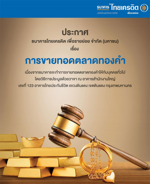 ธนาคารไทยเครดิต เพื่อรายย่อย จำกัด (มหาชน) ประกาศ ขายทอดตลาดทองคำให้กับบุคคลทั่วไป โดยวิธีการประมูลด้วยวาจา ณ อาคารสำนักงานใหญ่ เลขที่ 123 อาคารไทยประกันชีวิต แขวงดินแดง เขตดินแดง กรุงเทพมหานคร ในวันที่ 1 สิงหาคม 2557 เวลา 13.00 น. เป็นต้นไป