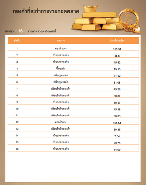 - ทองรายการใดไม่มีผู้สนใจเสนอราคา ผู้ทอดตลาดจะงดการขายไว้และนำทองออกขายทอดตลาดครั้งต่อไปตามประกาศของธนาคาร