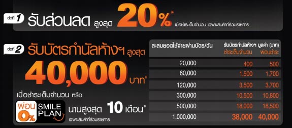 - การแลกรับบัตรกำนัล รวบรวมใบเสร็จ และเซลล์สลิป จากหมายเลขบัตรเดียวกัน วันเดียวกัน จากการใช้จ่ายผ่านบัตรฯ แบบชำระเต็มจำนวน หรือผ่อนชำระในงาน ครบตามข้อกำหนดเพื่อรับบัตรกำนัล โดยจะต้องทำการแลกรับภายในวันเดียวกันกับที่ทำรายการ / ไม่สามารถนำยอดชำระเต็มจำนวน และยอดชำระรวมกันเพื่อแลกรับบัตรกำนัล / จำกัดการแลกรับบัตรกำนัลสูงสุด 38,000 บาทต่อหมายเลขบัตร สำหรับชำระเต็มจำนวน และ 40,000 บาท ต่อหมายเลขบัตร สำหรับผ่อนชำระ ตลอดระยะเวลาส่งเสริมการขาย